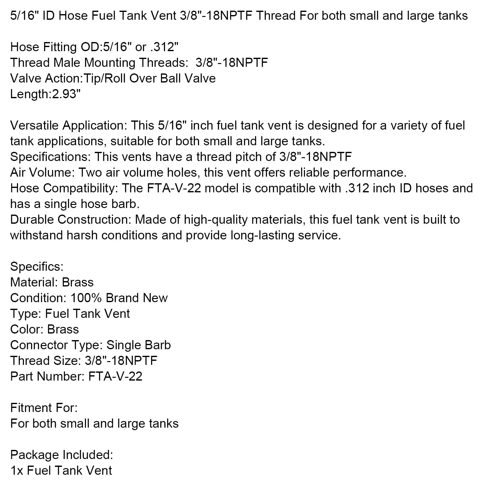 5/16インチIDホース燃料タンクベント3/8インチ-18NPTFスレッド小型タンクと大型タンクの両方に対応