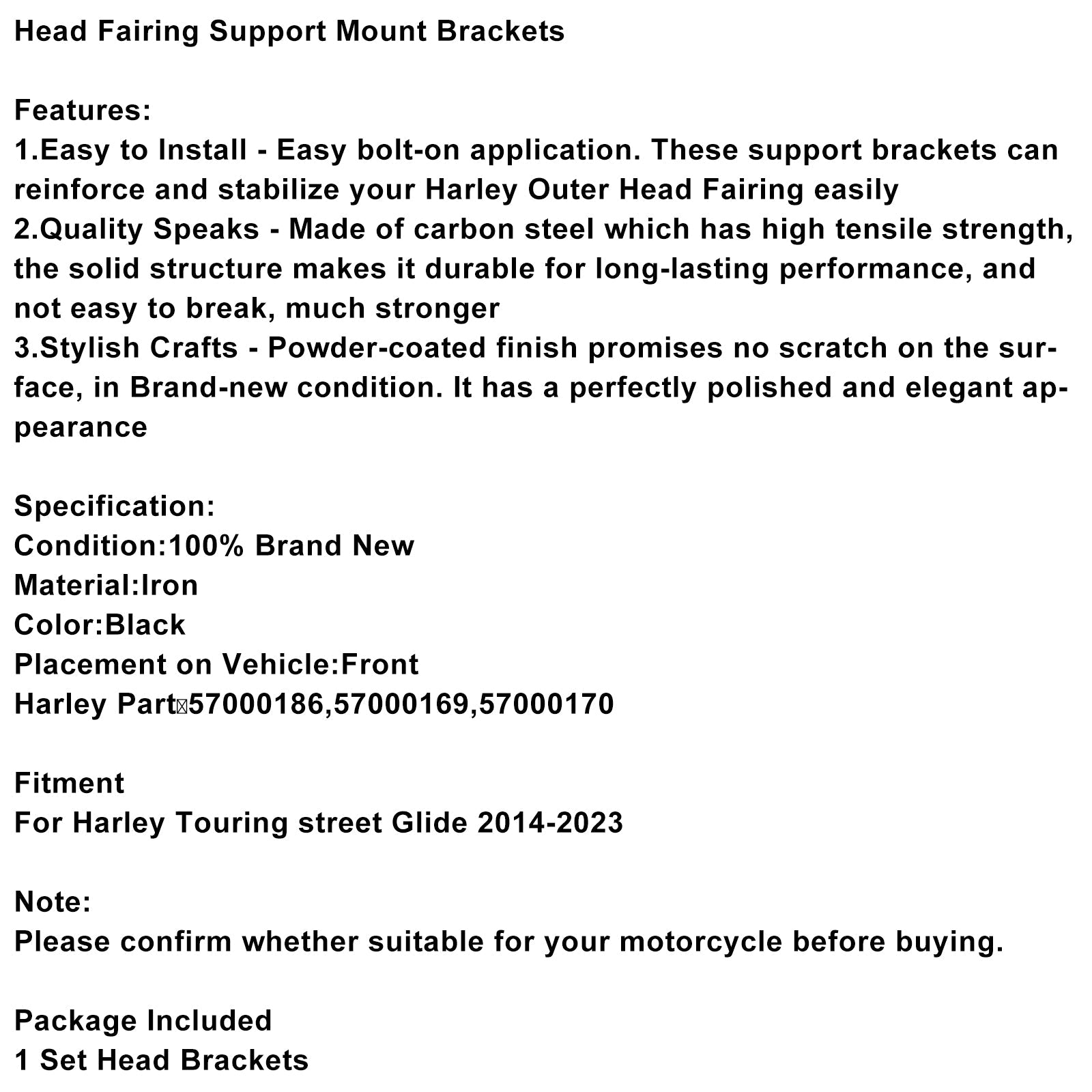 1.取り付け簡単 - ボルトで簡単に取り付けられます。これらのサポートブラケットは、ハーレーのアウターヘッドフェアリングを簡単に補強し、安定させます。
