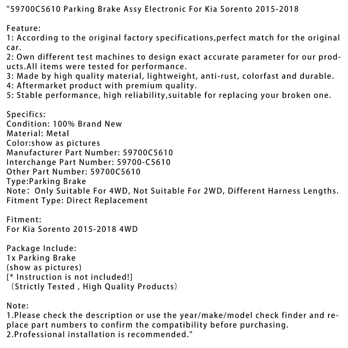 2015-2018 Kia Sorento 4WD パーキングブレーキアセンブリ 電子部品 59700C5610