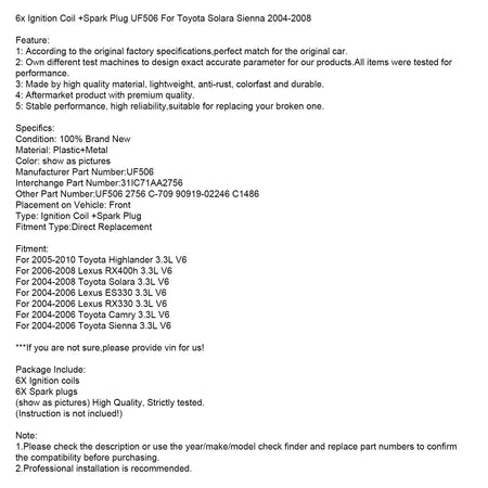 6x イグニッションコイル + スパークプラグ UF506 トヨタ ソラーラ シエナ 2004-2008 に適合 31IC71AA2756 UF506