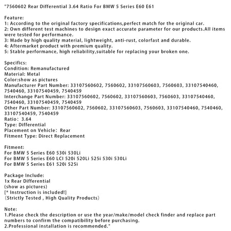 7560602 リアディファレンシャル 3.64 比 BMW 5シリーズ E60 E61用
