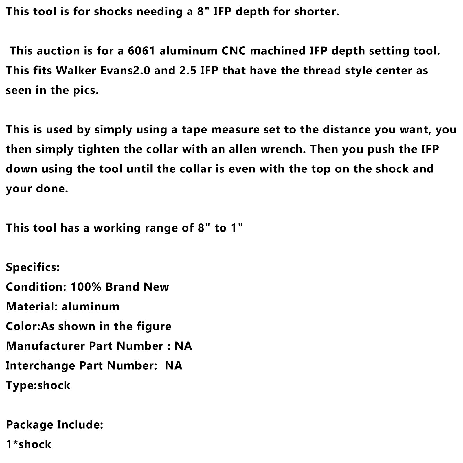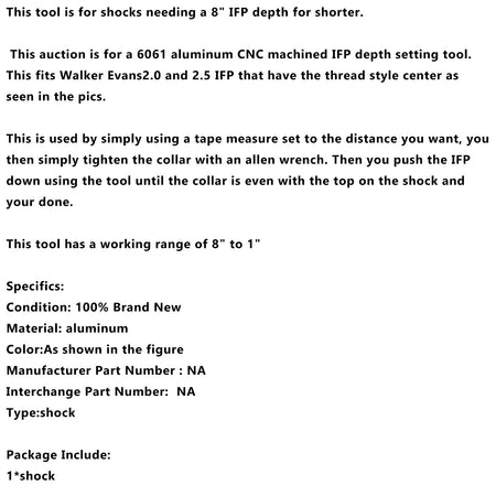 このオークションは、6061アルミニウム製のCNC加工IFP深さ設定ツールです。写真にあるように、ネジ山付きセンターを持つWalker Evans2.0および2.5IFPに適合します。