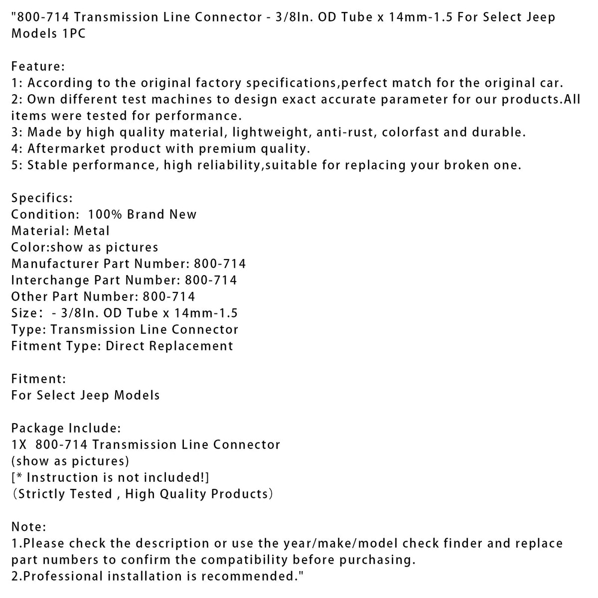 800-714 伝送ラインコネクタ - 3/8インチ OD チューブ x 14mm-1.5 一部のジープモデル用 1個