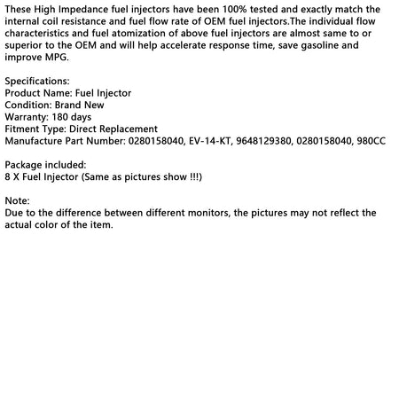 これらの高インピーダンス燃料インジェクターは 100% テスト済みで、OEM 燃料インジェクターの内部コイル抵抗および燃料流量と正確に一致します。上記の燃料インジェクターの個々のフロー特性および燃料の霧化は OEM とほぼ同じかそれ以上であり、応答時間の短縮、ガソリンの節約、MPG の向上に役立ちます。