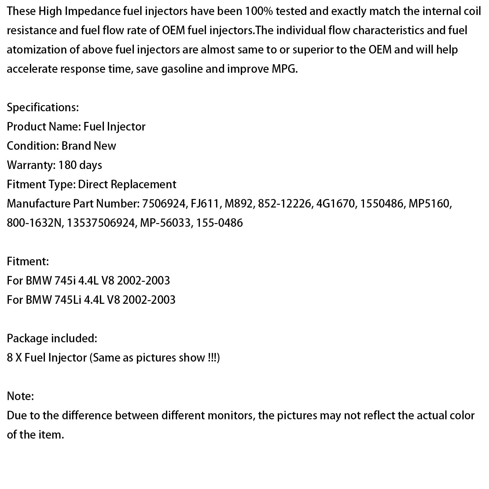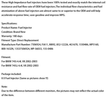 これらの高インピーダンス燃料インジェクターは 100% テスト済みで、OEM 燃料インジェクターの内部コイル抵抗および燃料流量と正確に一致します。上記の燃料インジェクターの個々のフロー特性および燃料の霧化は OEM とほぼ同じかそれ以上であり、応答時間の短縮、ガソリンの節約、MPG の向上に役立ちます。