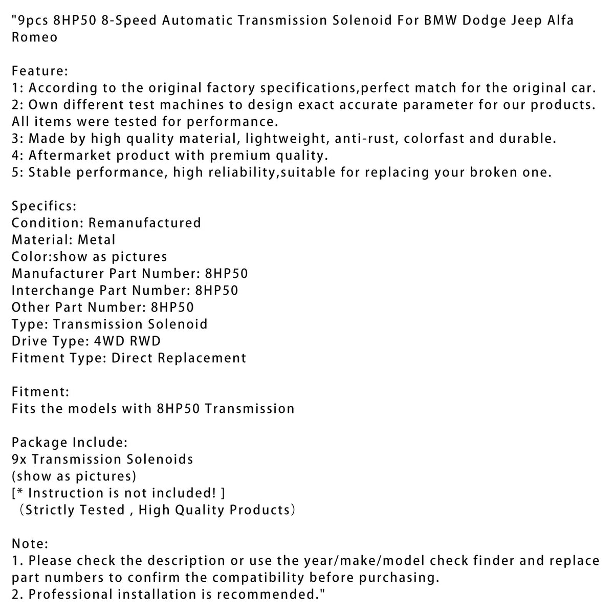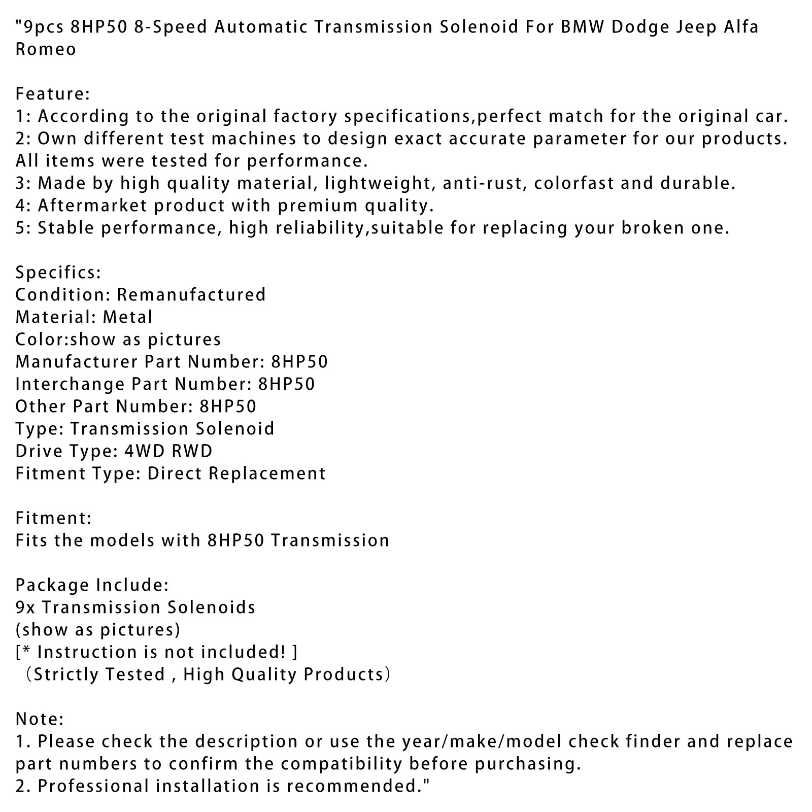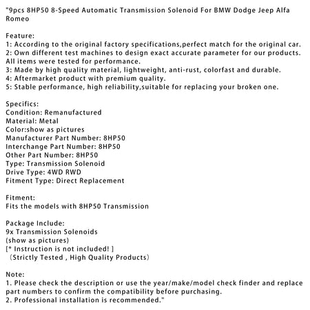 9個 8HP50 8速オートマチックトランスミッションソレノイド BMW ダッジ ジープ アルファロメオ用