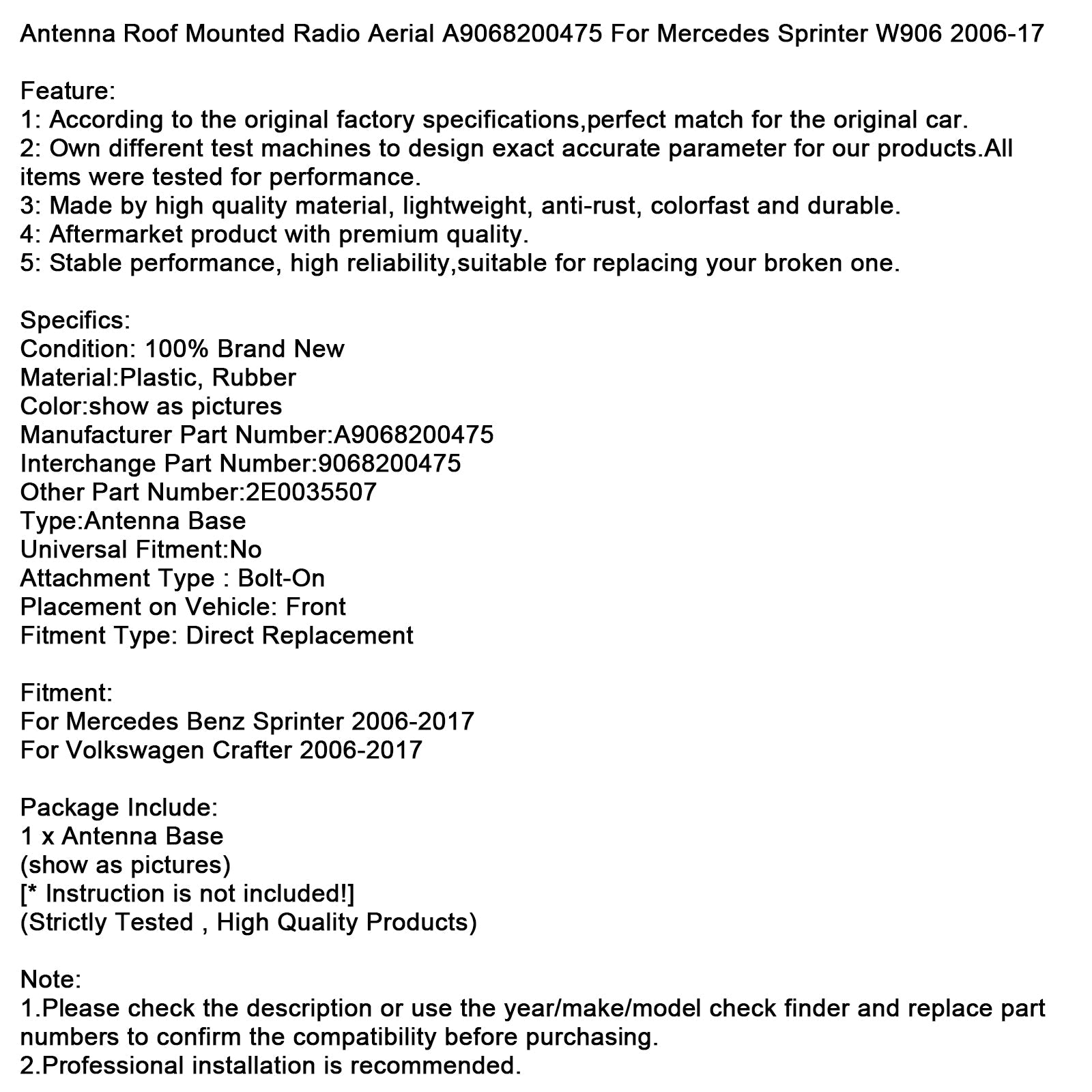 アンテナ ルーフマウントラジオアンテナ A9068200475 メルセデス スプリンター W906 2006-17 に適合