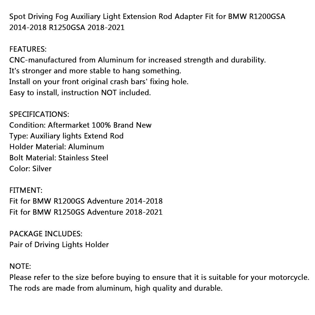 Areyourshop スポットフォグ ドライビングライト ロッドホルダー BMW R1200GSA 2014-2018 R1250GSA 18-21 シルバーに適合
