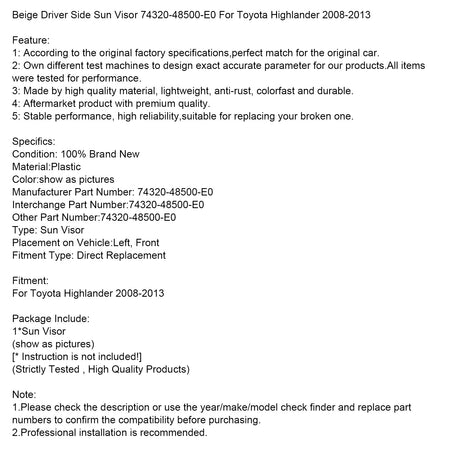 ベージュ 左側サンバイザー トヨタ ハイランダー 2008-2013 74320-48500-E0 に適合