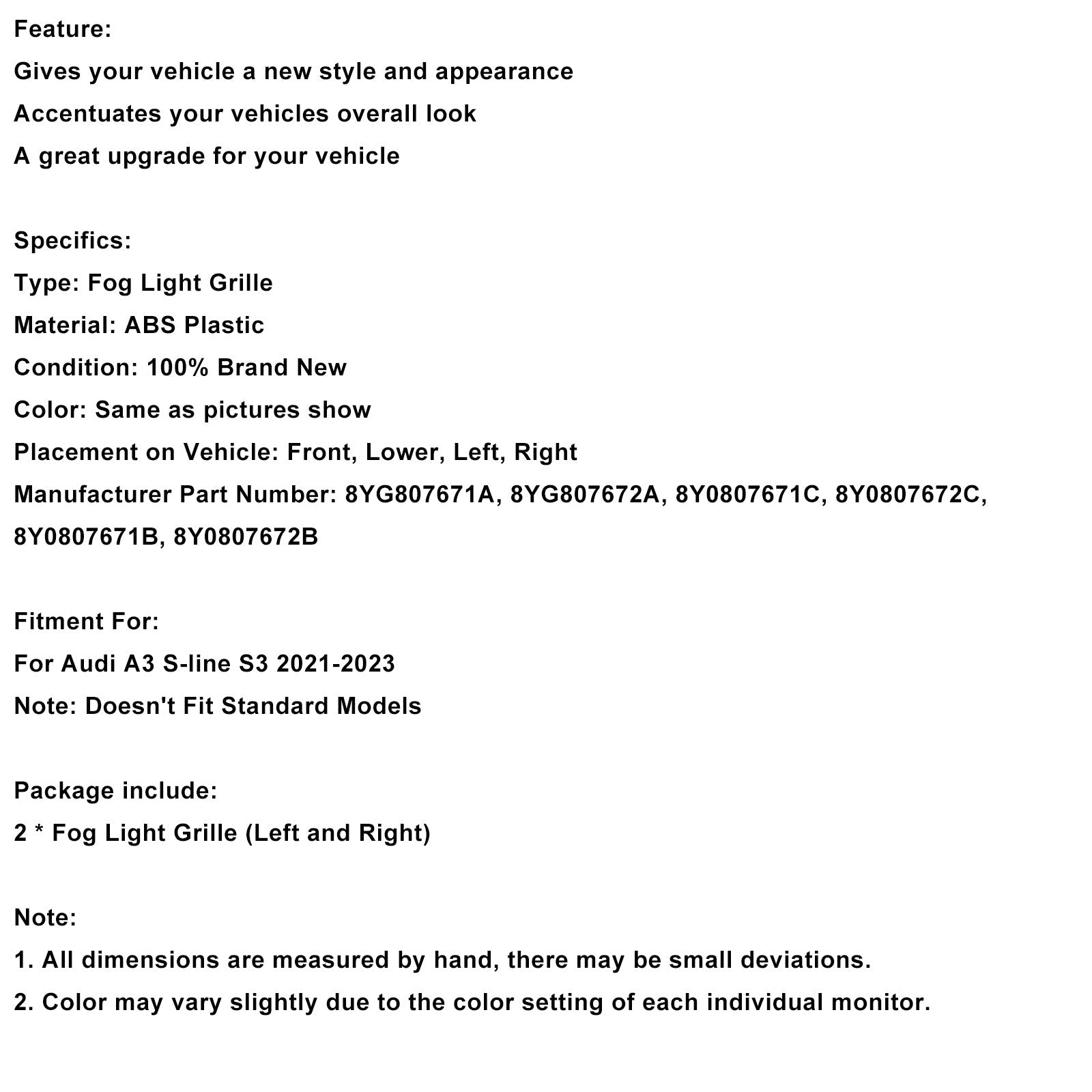 メーカー部品番号: 8YG807671A、8YG807672A、8Y0807671C、8Y0807672C、8Y0807671B、8Y0807672B