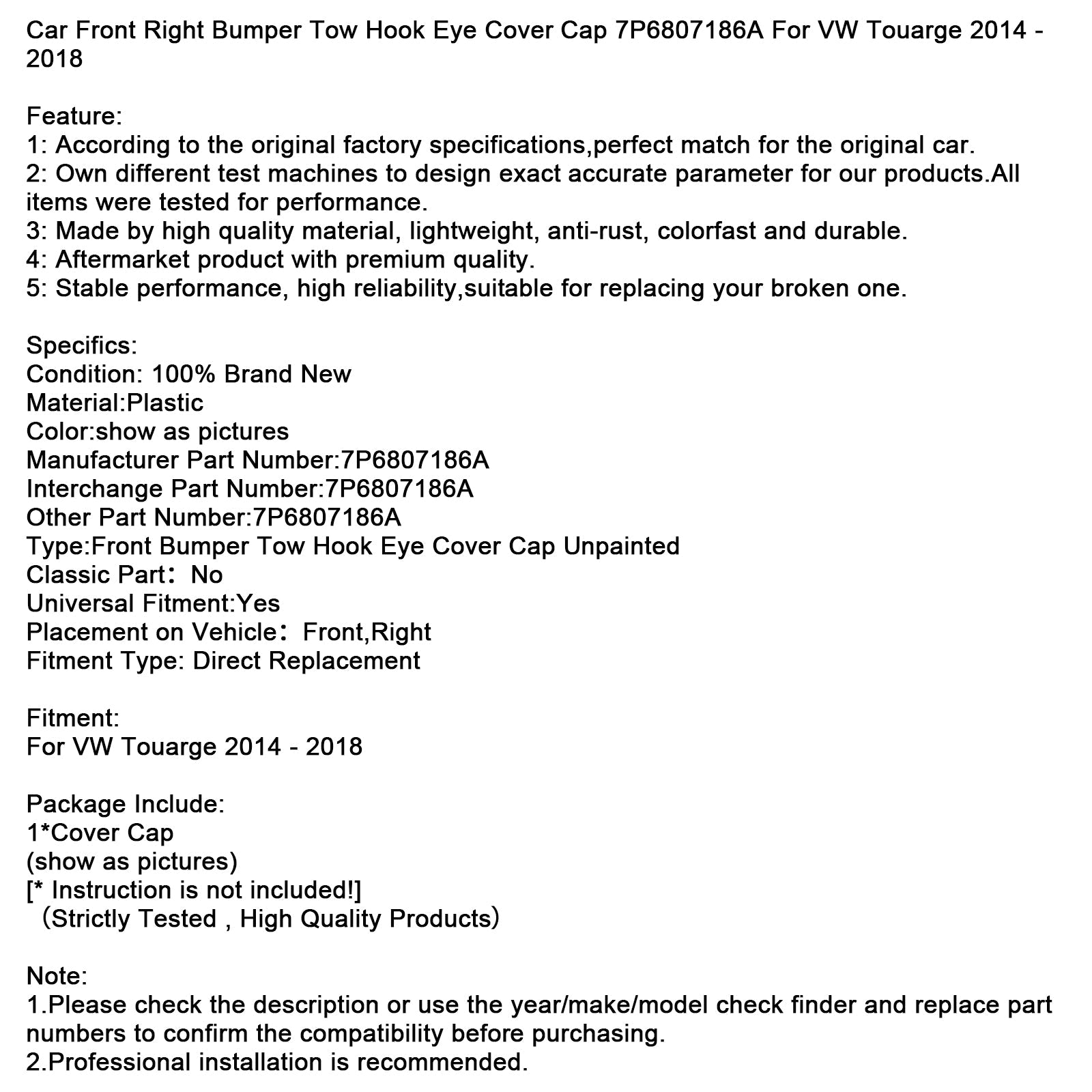 車用フロント右バンパー牽引フックアイカバーキャップ 7P6807186A VW Touarge 2014 - 2018用