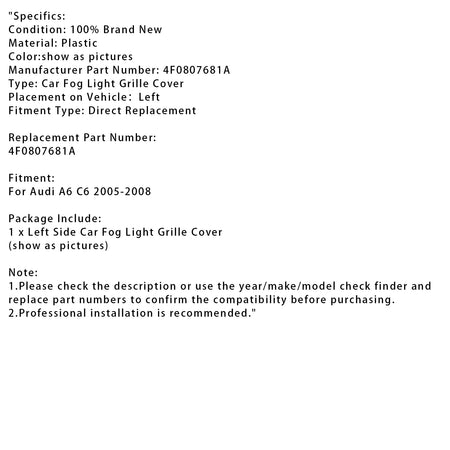 車用左側フォグランプグリルカバー 4F0807681A Audi A6 C6 2005-2008用