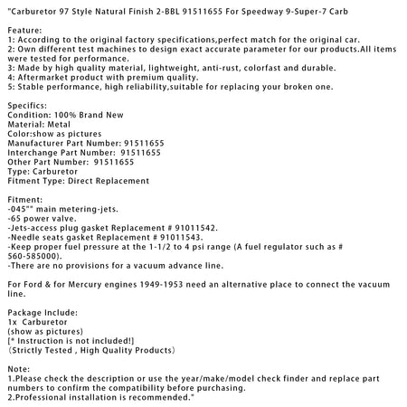 キャブレター 97スタイル ナチュラルフィニッシュ 2BBL 91511655 スピードウェイ 9-スーパー-7 キャブレター用