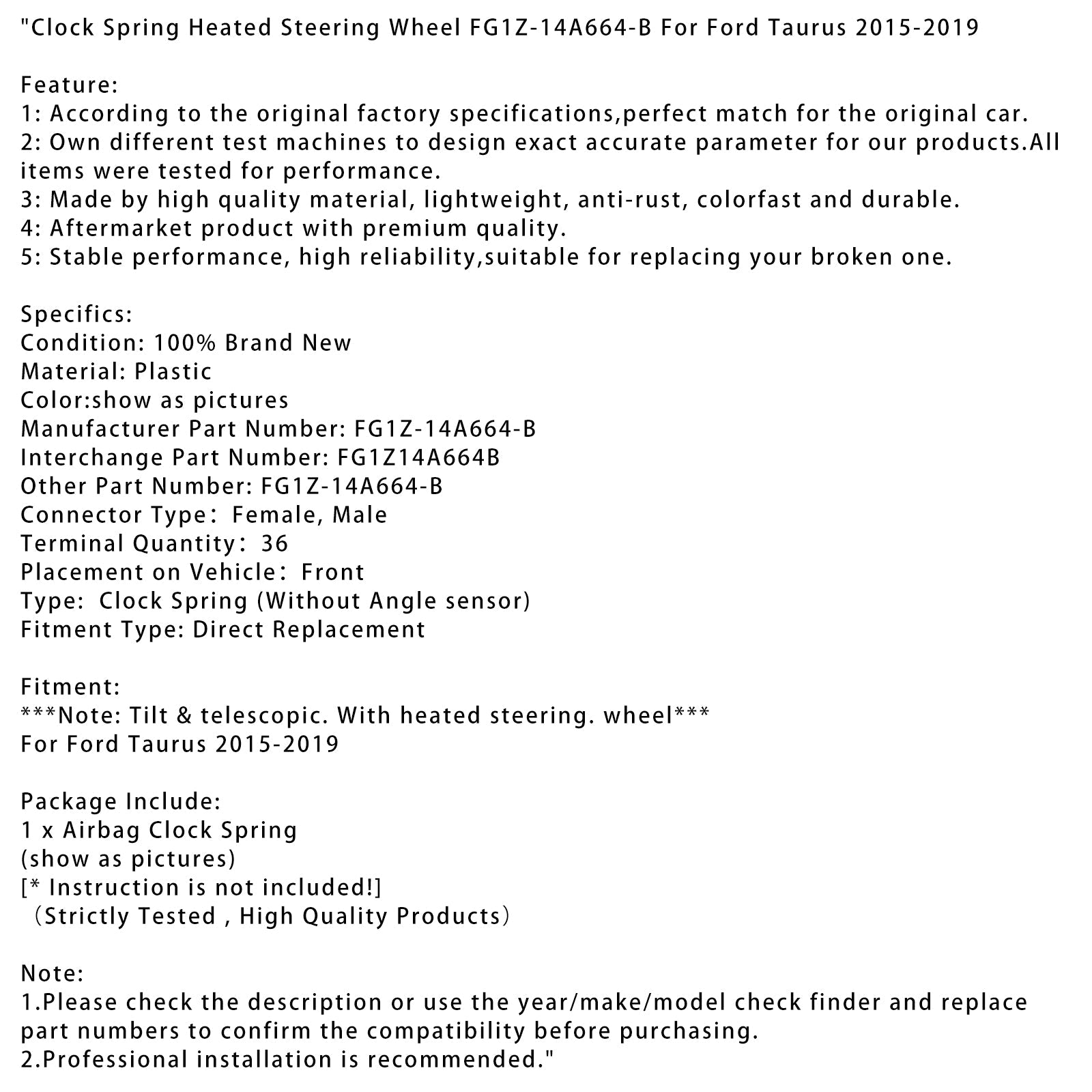 2015-2019 フォード トーラス クロックスプリング ヒーター付きステアリングホイール FG1Z-14A664-B