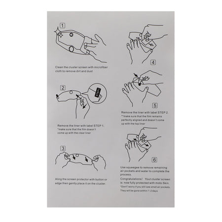 インストール手順: 1.Reinigen Sie das Cluster mit einem Mikrofasertuch、um Schmutz und Staub zu entfernen。 2. チケット STEP1 とライナーを確認し、ライナーを確認してください。 3. Wenn der Liner vollst?ndig entferntist, sprühen Sie viel Wasser auf die Klebeseite。 4. クラスタの詳細を表示します。 5.Drücken Sie Wasser und Lufteinschlüsse vorsichtig mit einem Rakel heraus。 Versuchen Sie、so viel Wasser und Lufteinschlüsse wie m?glich zu entfernen。 6. Entfernen Sie den Liner mit dem Eticett STEP2、stellen Sie sicher、dass der Film perfekt ausgerichtet bleibt und nicht mit dem oberen Liner auftaucht。 7.Verwenden Sie einen Rakel、um verbleibende Lufteinschlüsse und Wasser zu entfernen、um den Vorgang abzuschlie?en。