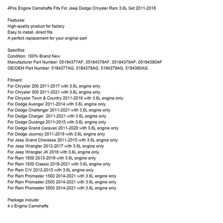 エンジンカムシャフト 4個入り ジープ ダッジ クライスラー ラム 3.6L セット 2011-2018に適合