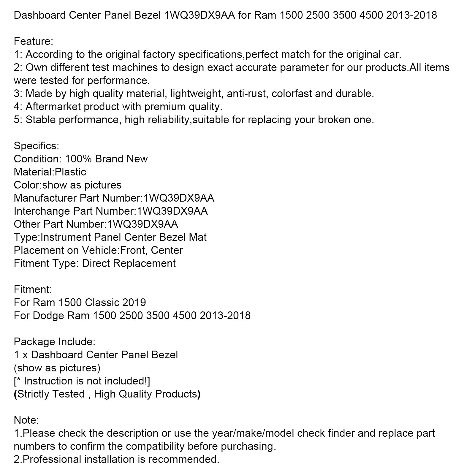 ダッシュボードセンターパネルベゼル 1WQ39DX9AA ラム 1500 2500 3500 4500 2013-2018用