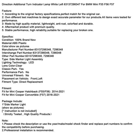 方向指示灯 追加 ホワイト 左 63137298347 BMW Mini F55 F56 F57用