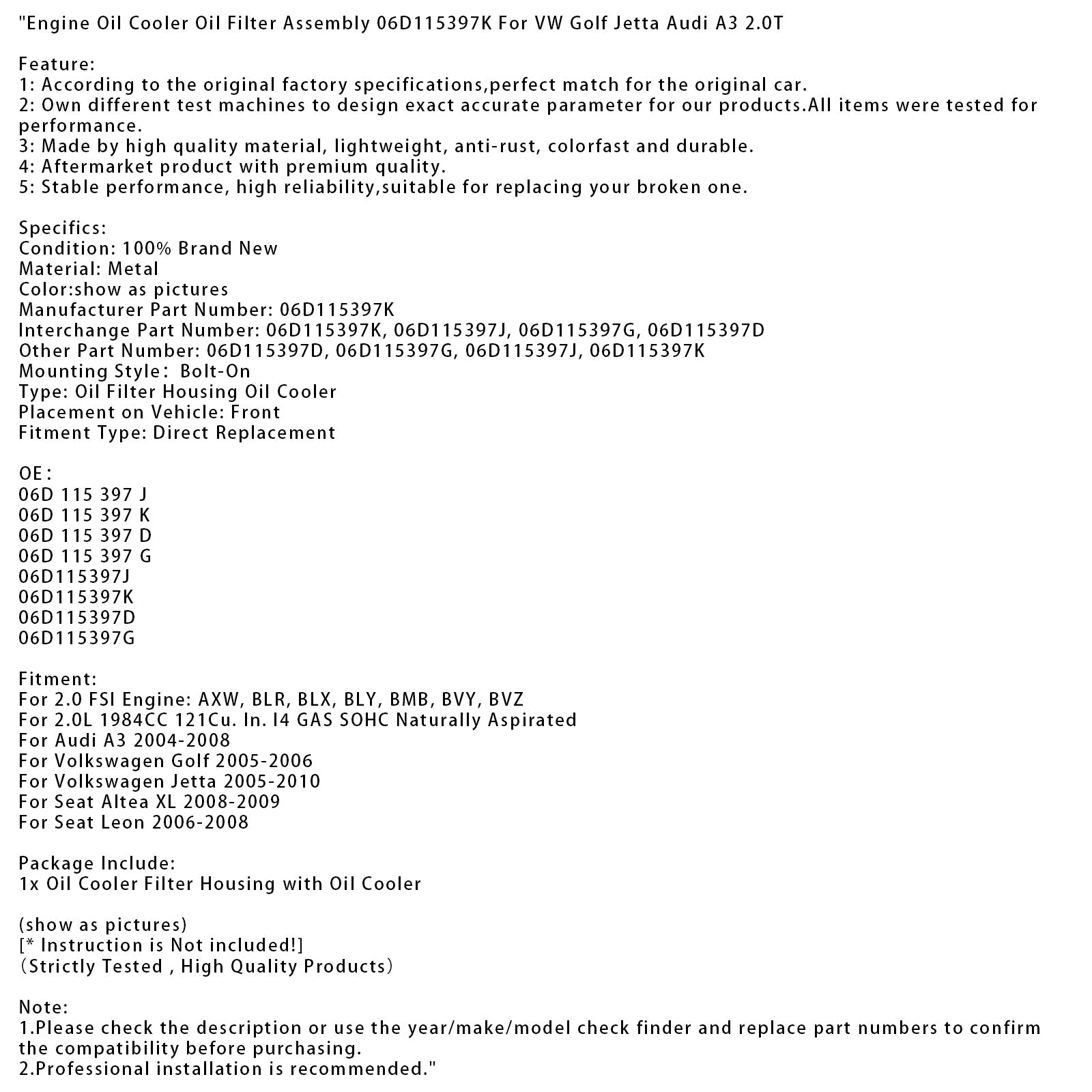 エンジンオイルクーラーオイルフィルターアセンブリ 06D115397K VWゴルフジェッタアウディA3 2.0T用