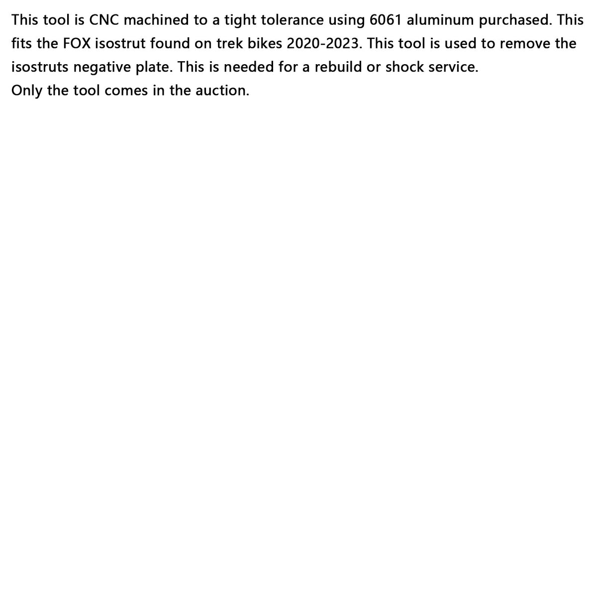 このツールは、6061アルミニウムをCNC加工し、厳密な公差で製造されています。トレックの2020~2023年モデルのFOXアイソストラットに適合します。このツールは、アイソストラットのネガティブプレートを取り外すために使用します。リビルドやショックの修理に必要です。