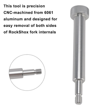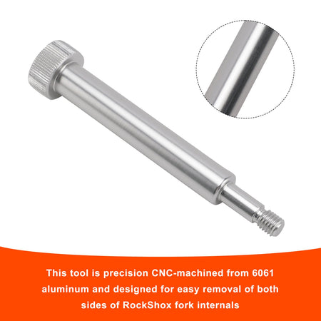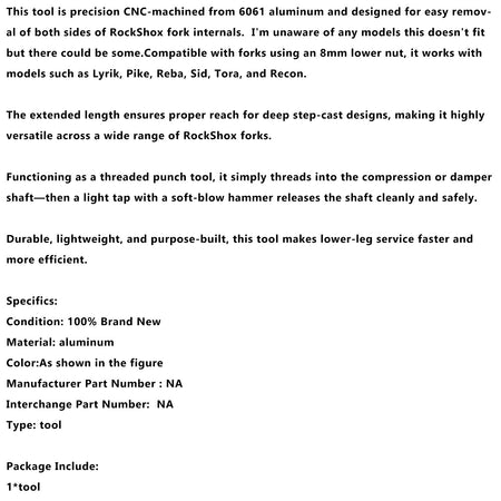 このツールは6061アルミニウムから精密CNC加工されており、RockShoxフォーク内部の両側を簡単に取り外せるように設計されています。このツールが適合しないモデルは今のところ分かりませんが、適合しないモデルもあるかもしれません。8mmのロワーナットを使用するフォークと互換性があり、Lyrik、Pike、Reba、Sid、Tora、Reconなどのモデルで使用できます。