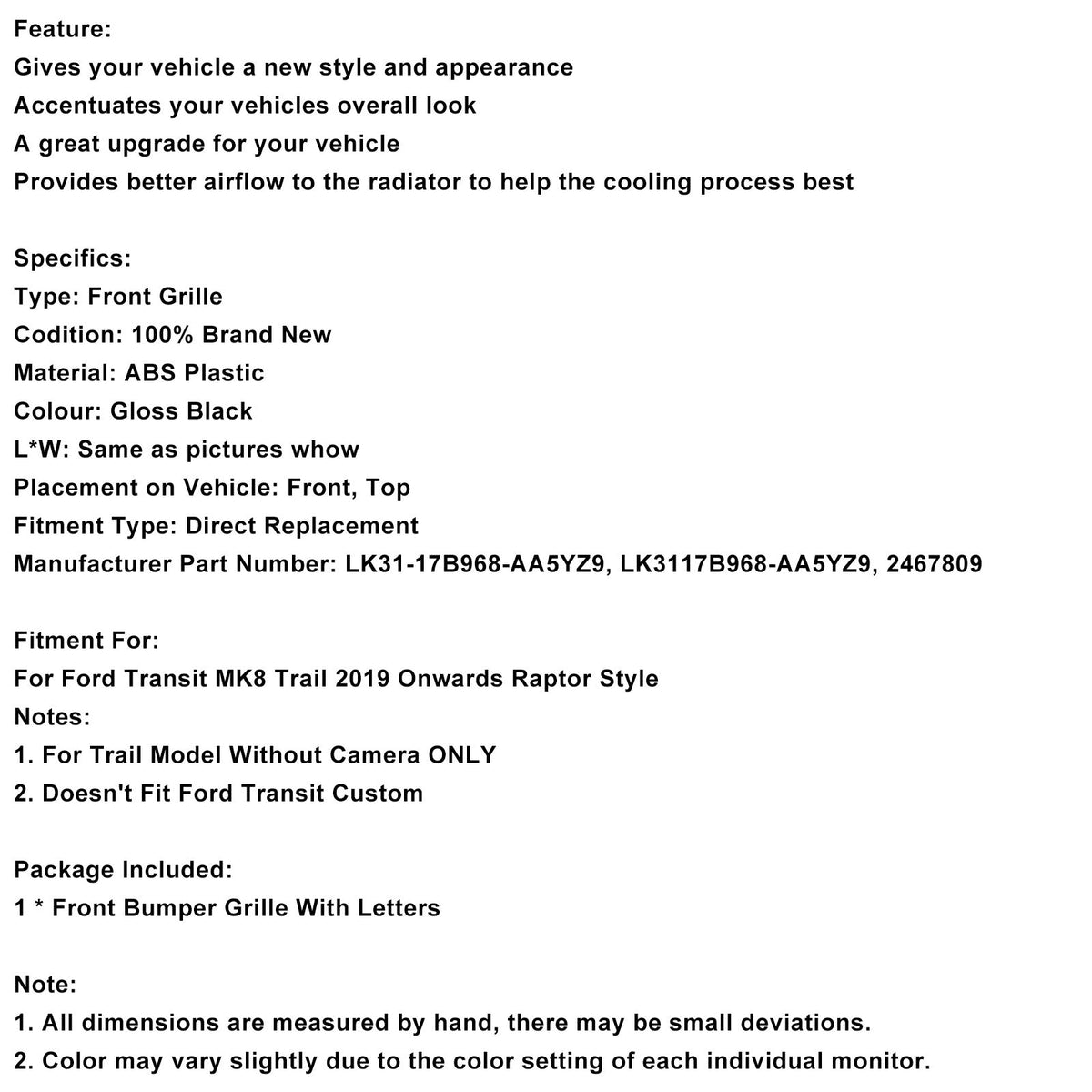 フロントバンパーグリル 2467809 フォードトランジット MK8 トレイル 2019年以降 ラプタースタイルに適合