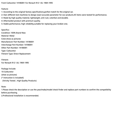 フロントキャブレター 14186001 ルノー R12 1.6L 1969-1995用