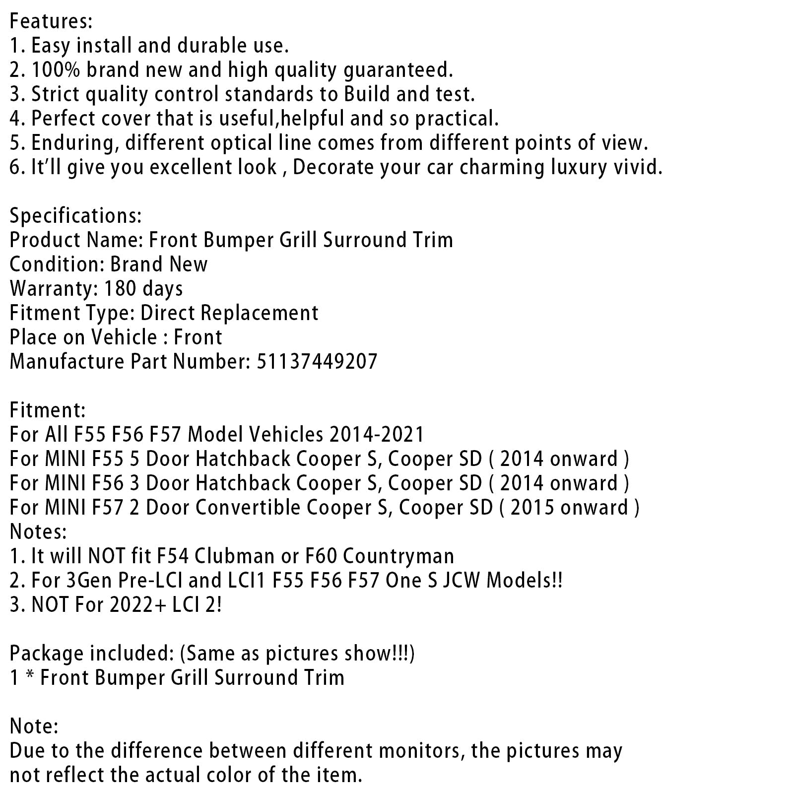 フロントグリル グリルサラウンド ミニクーパー F55 F56 F57 2014-2021 51137449207 に適合