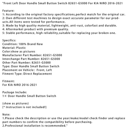 2016-2021 KIA NIRO フロント左ドアハンドル 小型ボタンスイッチ 82651-G5000