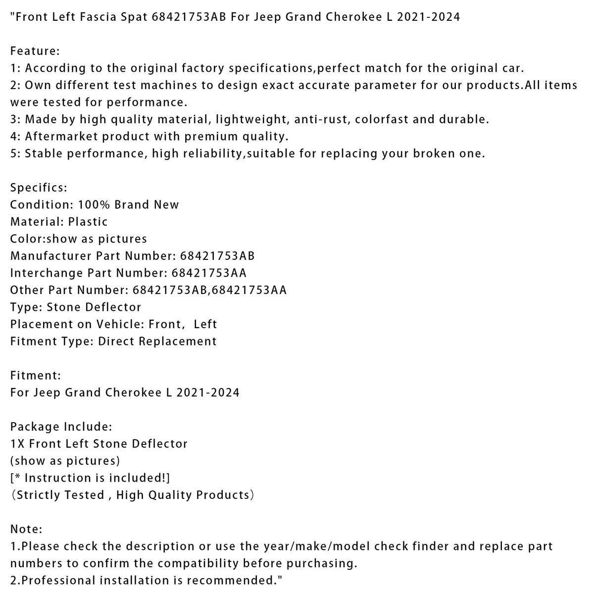 フロント左フェイシアスパット 68421753AB ジープ グランドチェロキー L 2021-2024用