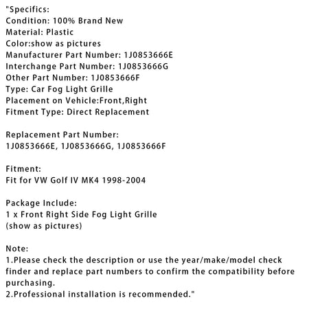 VWゴルフIV MK4 1998-2004に適合するフロント右側フォグランプグリル