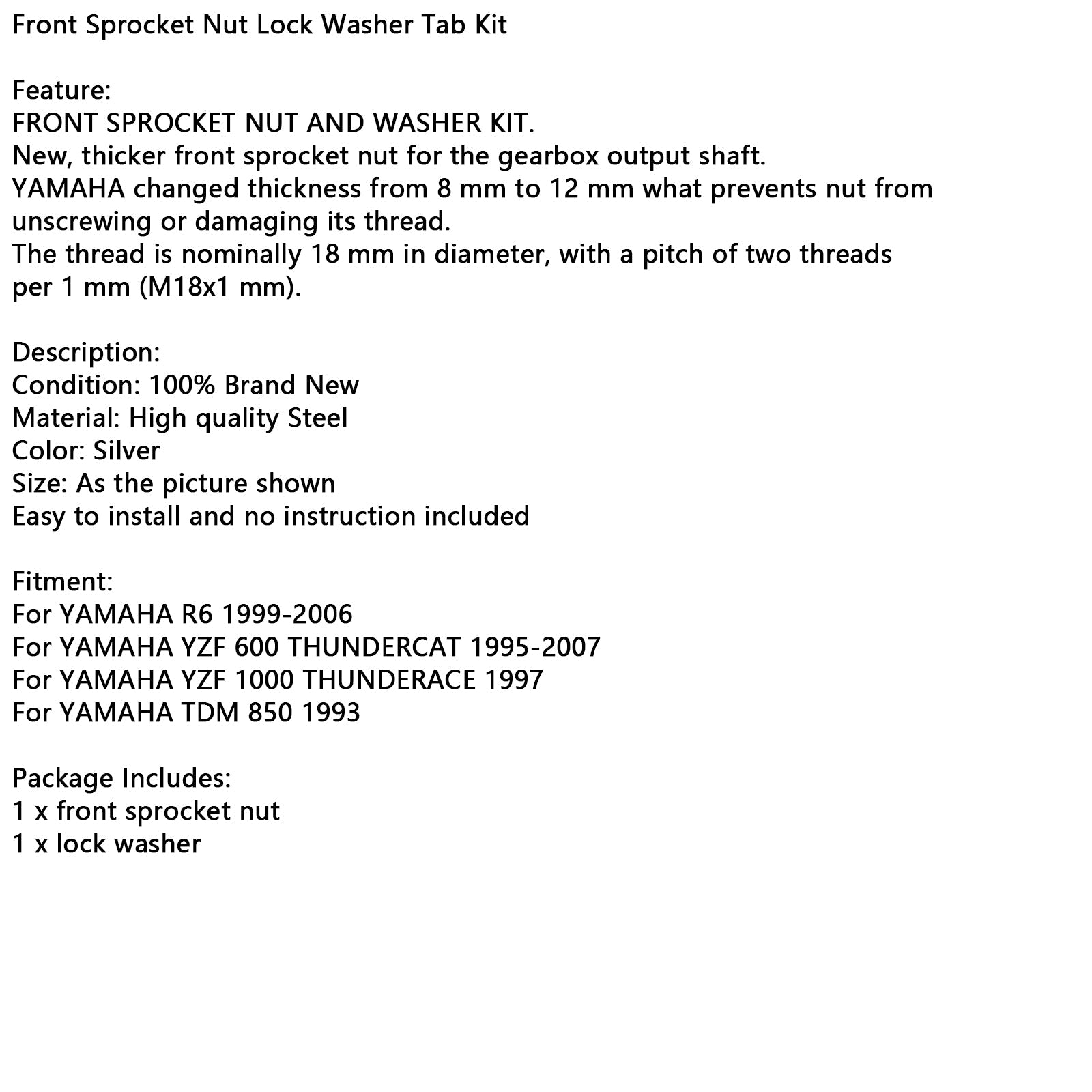 フロントスプロケットナットロックワッシャータブキット YAMAHA R6 YZF 600 1000 TDM 850に適合