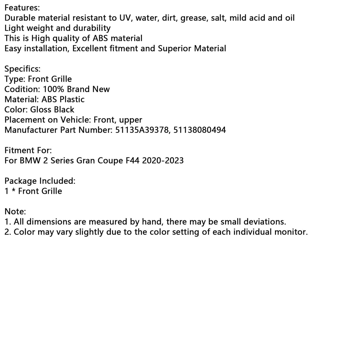 2020-2023 BMW 2シリーズ グランクーペ F44 グロスブラック フロントバンパーグリル グリル 51135A39378 51138080494