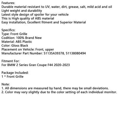グロスブラックフロントグリルグリル BMW 2シリーズ F44 2020-2023 クーペ M ダイヤモンドに適合