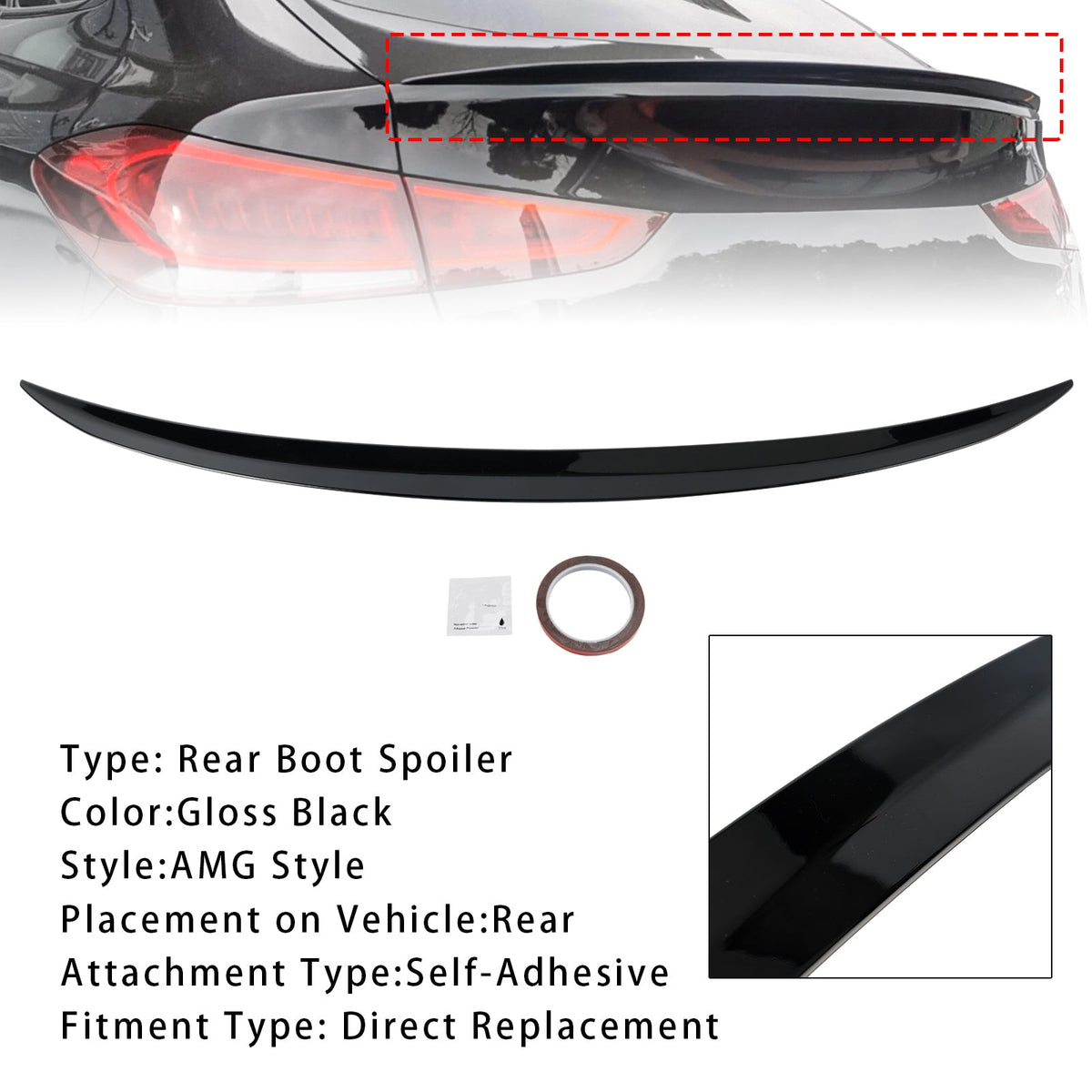 テープ1巻を同梱いたします。これは、スポイラー取り付け時に仮置きするためのもので、恒久的な対策としての使用を目的としたものではありません。スポイラーは、強力なテープ、接着剤、または穴あけ加工で取り付けることができます。