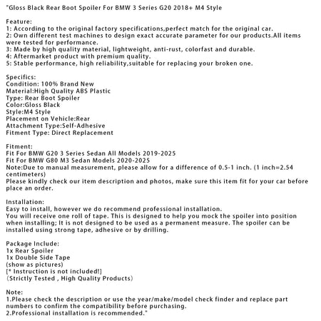 BMW 3シリーズ G20 2018+ M4スタイル用 グロスブラック リアブートスポイラー