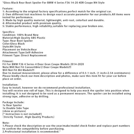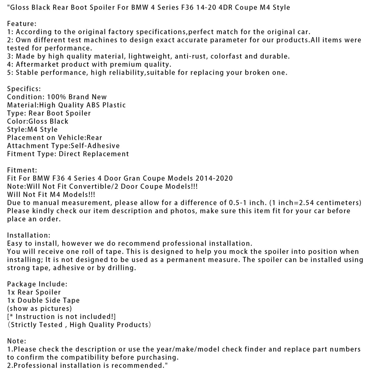 BMW 4シリーズ F36 14-20 4ドア クーペ M4スタイル用 グロスブラック リアブートスポイラー