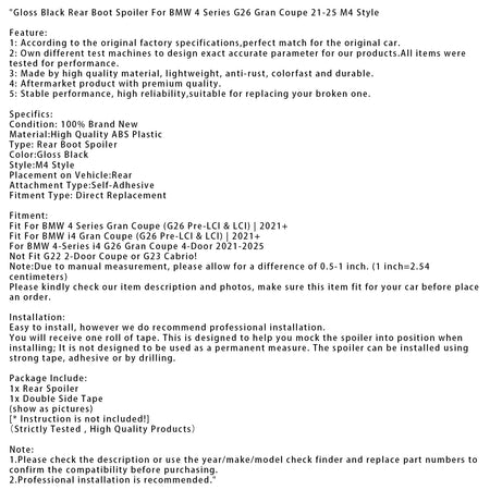 グロスブラックリアブートスポイラー BMW 4シリーズ G26 グランクーペ 2021-2025 M4スタイルに適合