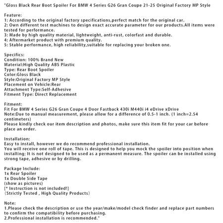 グロスブラックリアブートスポイラー BMW 4シリーズ G26 グランクーペ 2021-2025 純正工場製 MPスタイルに適合