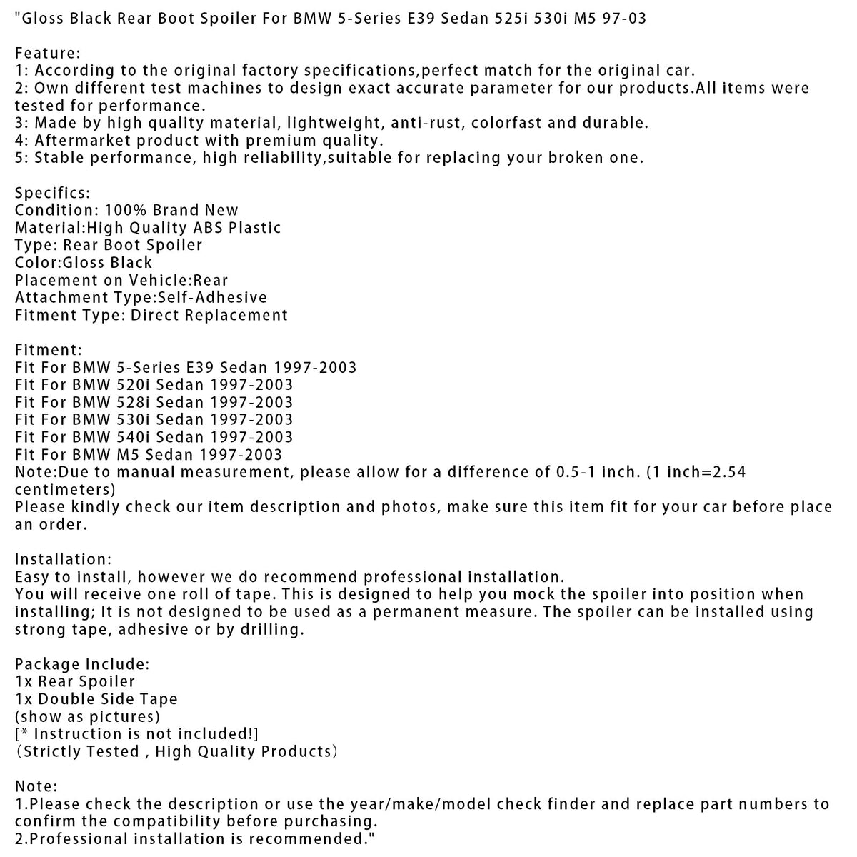 グロスブラック リアブートスポイラー BMW 5シリーズ E39 セダン 525i 530i M5 97-03に適合