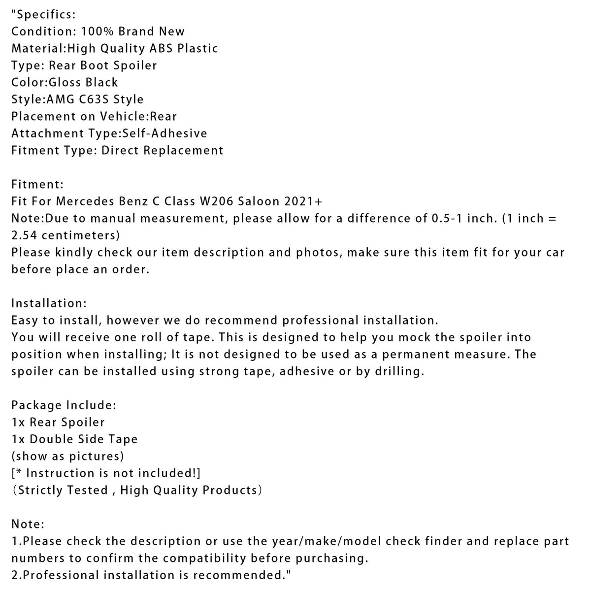 テープ1巻を同梱いたします。これは、スポイラー取り付け時に仮置きするためのもので、恒久的な対策としての使用を目的としたものではありません。スポイラーは、強力なテープ、接着剤、または穴あけ加工で取り付けることができます。