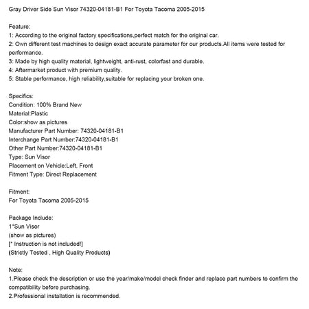 グレーの左側サンバイザー、トヨタ タコマ 2005-2015 74320-04181-B1 に適合