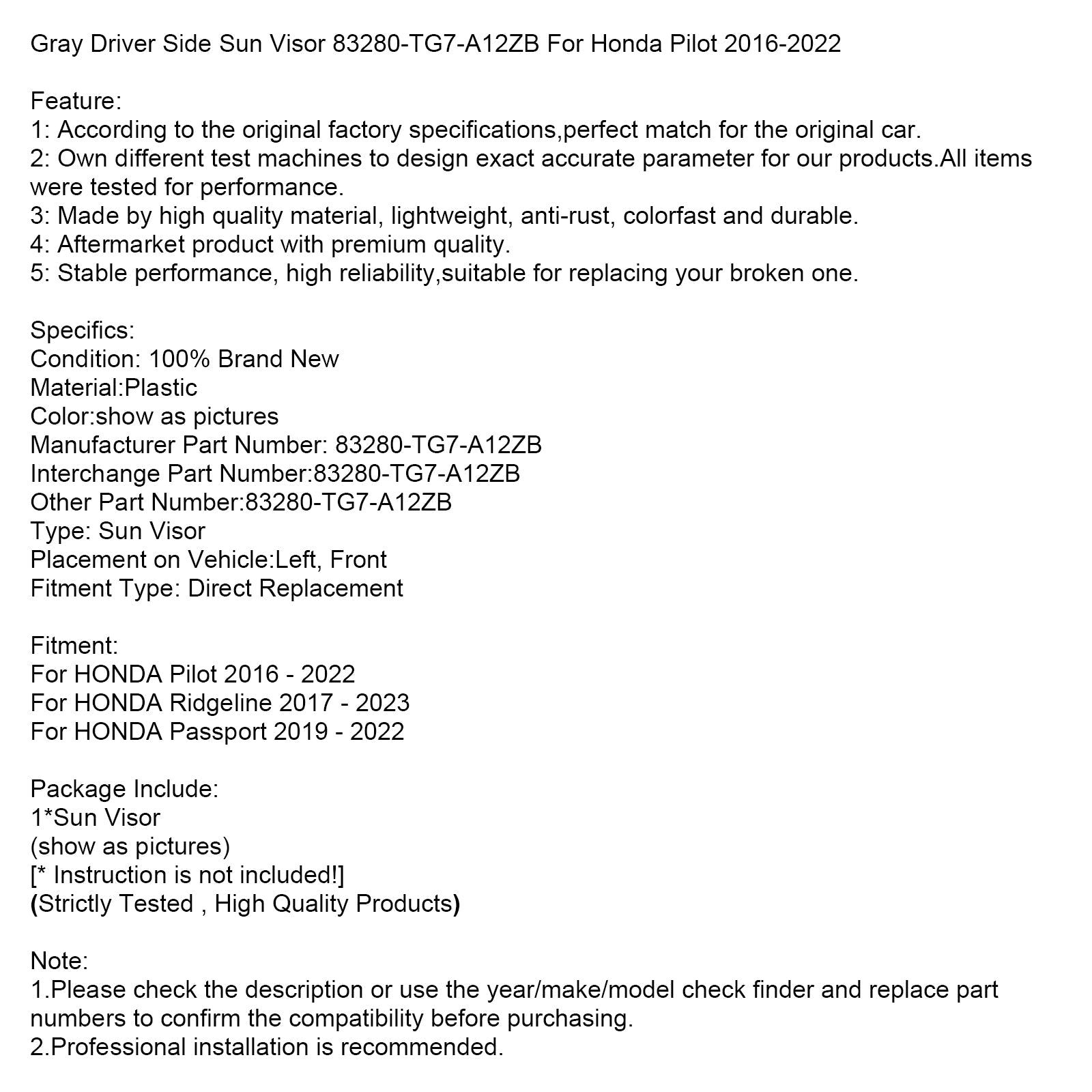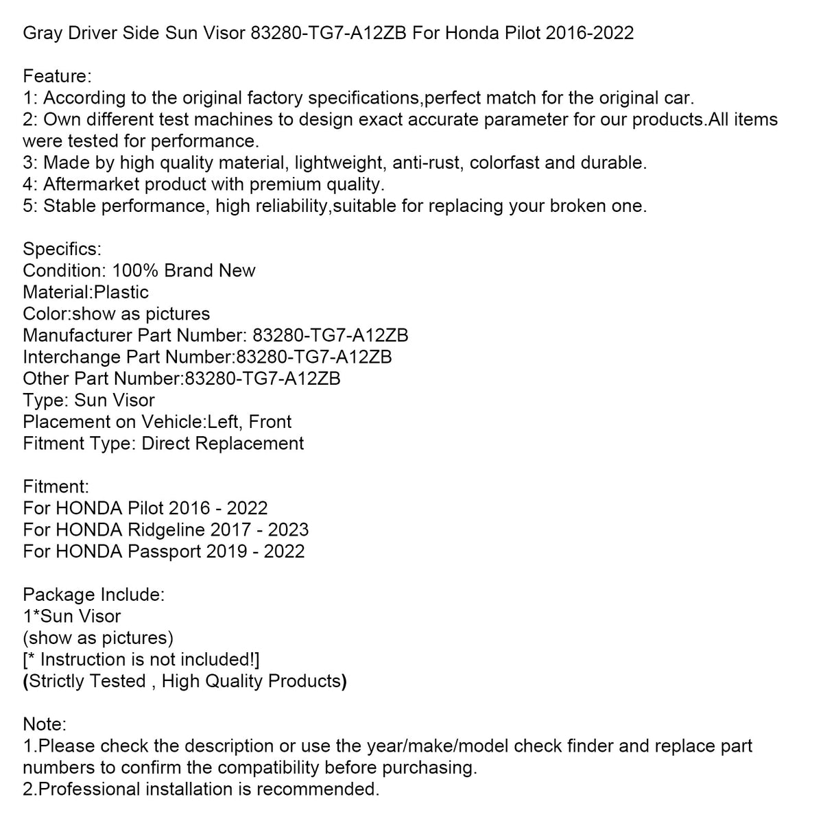 グレー 運転席側サンバイザー 83280-TG7-A12ZB ホンダ パイロット 2016-2022年式用