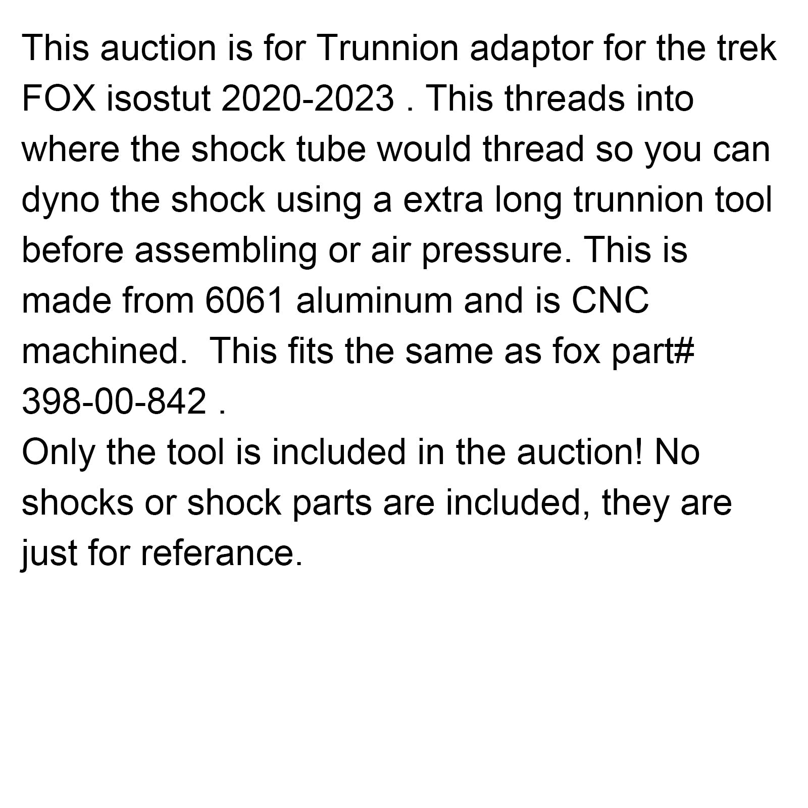 このオークションは、トレックFOX isostut 2020-2023用のトラニオンアダプターです。ショックチューブのネジ山にねじ込むため、組み立てや空気圧調整の前に、長めのトラニオンツールを使ってショックのダイナモテストを行うことができます。6061アルミニウム製で、CNC加工されています。FOX部品番号398-00-842に適合します。