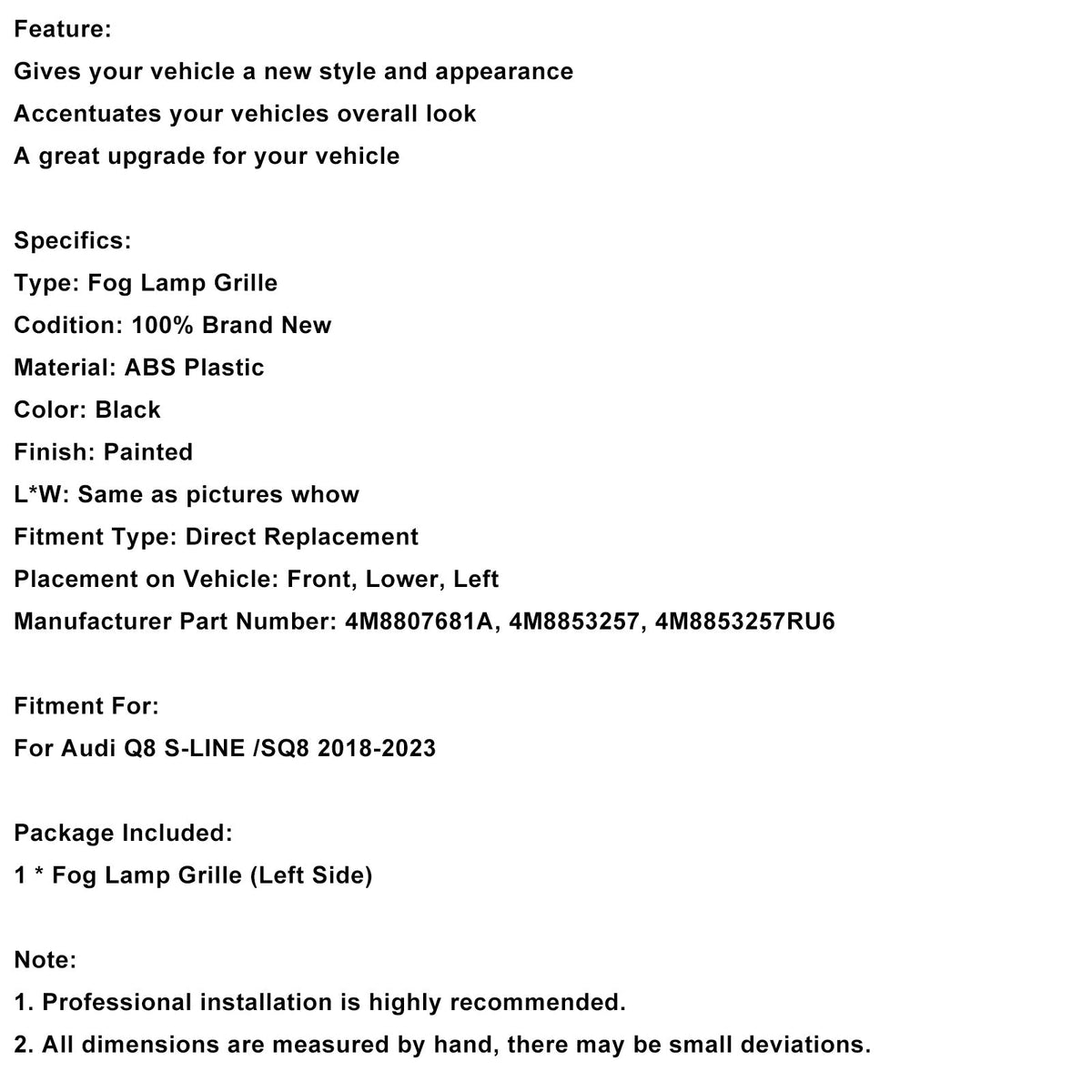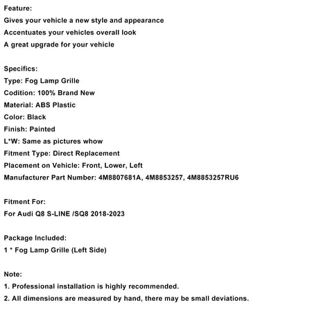 2018-2023 アウディ Q8 S-Line SQ8 左フロントバンパーグリルトリム 4M8807681A