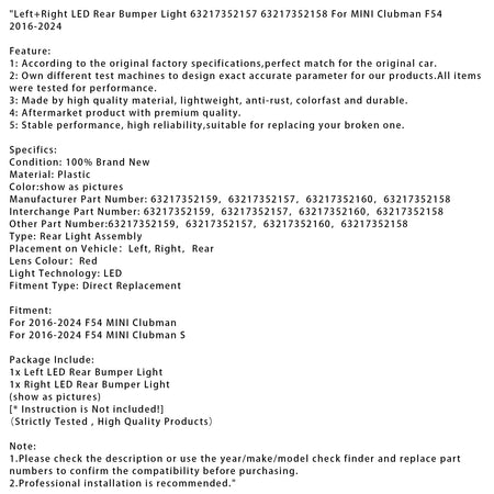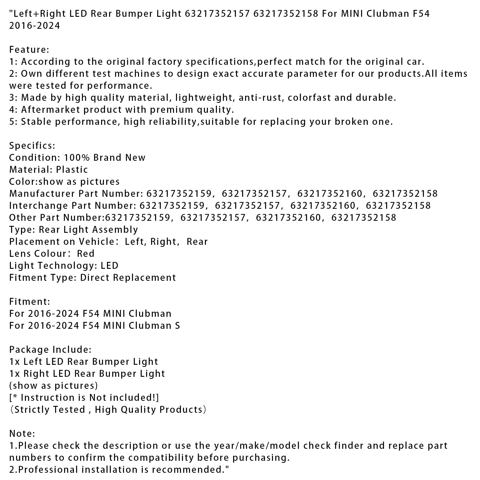 左+右 LED リアバンパーライト 63217352157 63217352158 MINI Clubman F54 2016-2024用