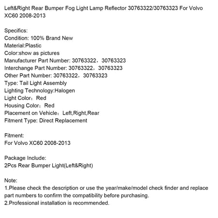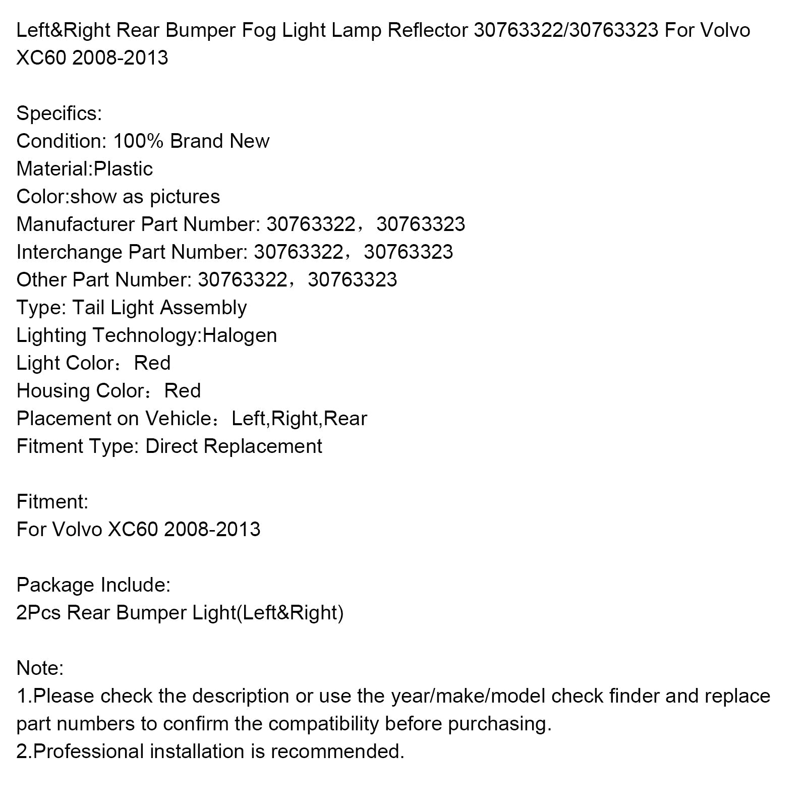 左&右リアバンパーフォグライトランプリフレクター30763322/30763323 ボルボXC60 2008-2013用