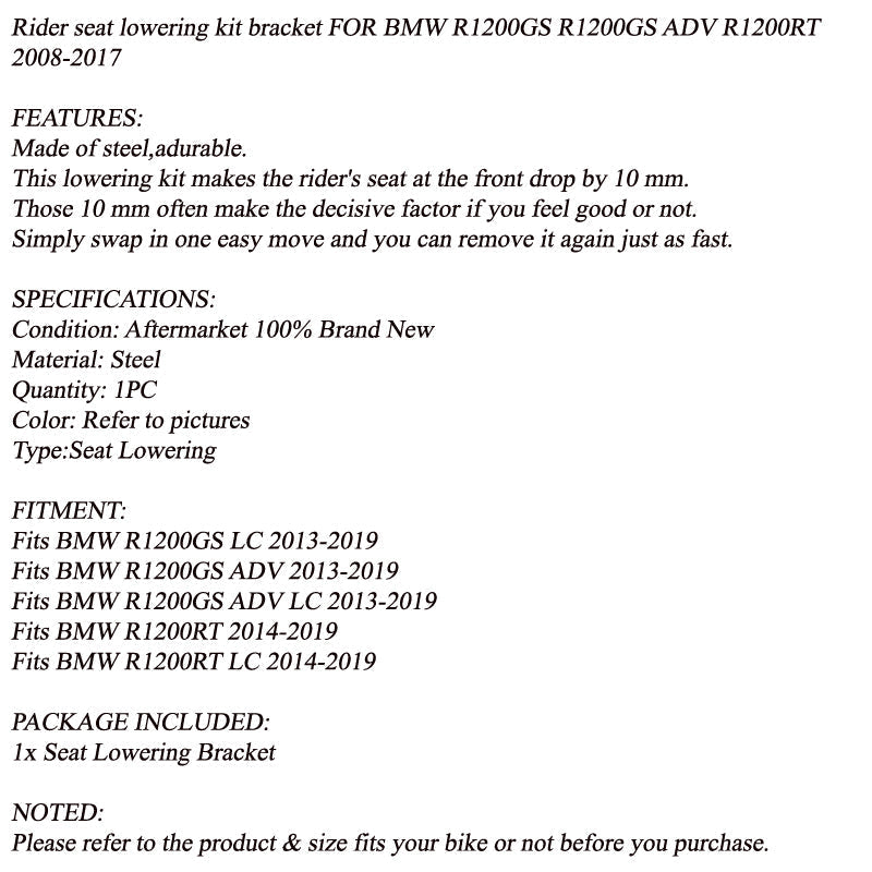 ライダーシート下降キット 10mm BMW R1200RT R1200GS R1250GS LC / ADV 08-18 汎用
