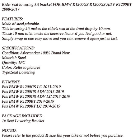 ライダーシート下降キットブラケット BMW R1200GS R1200GS ADV R1200RT 2008-2017用