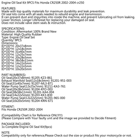 9個のエンジンオイルシールキットセット ホンダCR250R 2002-2004 cr250r cr-250r ジェネリック